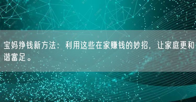 随着社会的进步和女性地位的提高,越来越多的宝妈希望在家照顾孩子的同时,也能挣钱补贴家用。其实,这并不是不可能的事情。宝妈们可以通过一些在家赚钱的新方法和妙招,既能兼顾家庭,又能增加收入。接下来,让我们一起探讨这些让家庭更和谐富足的妙招。